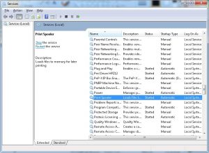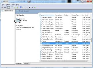 - Setelah ketemu Print Spooler, perhatikan apakah print spooler dalam keadaan hidup atau mati, jika masih dalam keadaan hidup maka anda hanya tinggal merestartnya saja, namu jika dalam keadaan mati maka ada harus menghidupkannya kembali